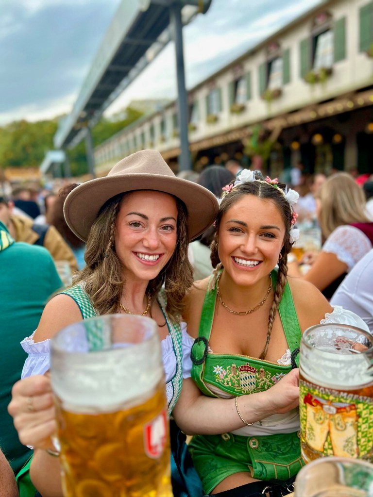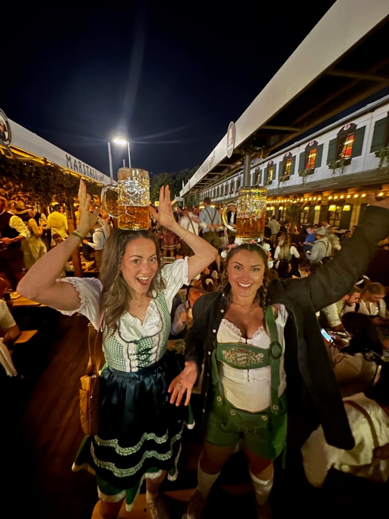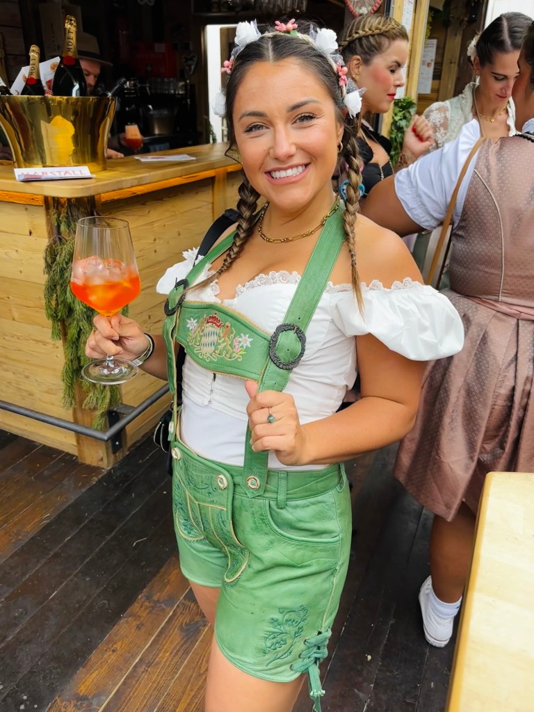 One of the first things on my Oktoberfest agenda? Snagging traditional Bavarian attire! Thanks to some pre-planning, my friend and I rocked dirndls -and “Ladyhosen”(a first for us) and fully embraced the festive spirit. Trust me, there’s something magical about dressing the part β it’s like stepping into a whole new world of merriment.